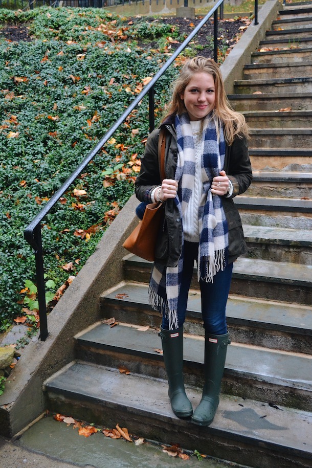 Everyone knows that one of the reasons why fall style is so fabulous is simply the option to layer, layer, and layer some more. When it comes to layering up, I love sticking to timeless and preppy wardrobe staples like cable knit sweaters, neutral jackets, and plaid or gingham patterned accessories to mix and match for a comfortable and cozy look. However, when I noticed the "cold-shoulder" trend popping up on some items that otherwise would be just your average top or sweater, I decided to try it out and see if I could pull of the look! Of course, leave it to me to find the preppiest version of a trendy piece, but nevertheless I still am pretty excited about this sweater! I paired it with my Barbour, this fun gingham scarf, and my trusty Hunter boots. It was super rainy the day I shot this outfit so I actually took these photos behind my dorm with one of my friend's right when I finished my classes. Surprisingly it's pretty warm this week in Bethlehem, but last week was really chilly and all of the layers were definitely necessary.